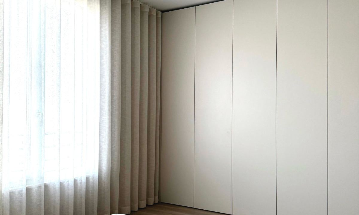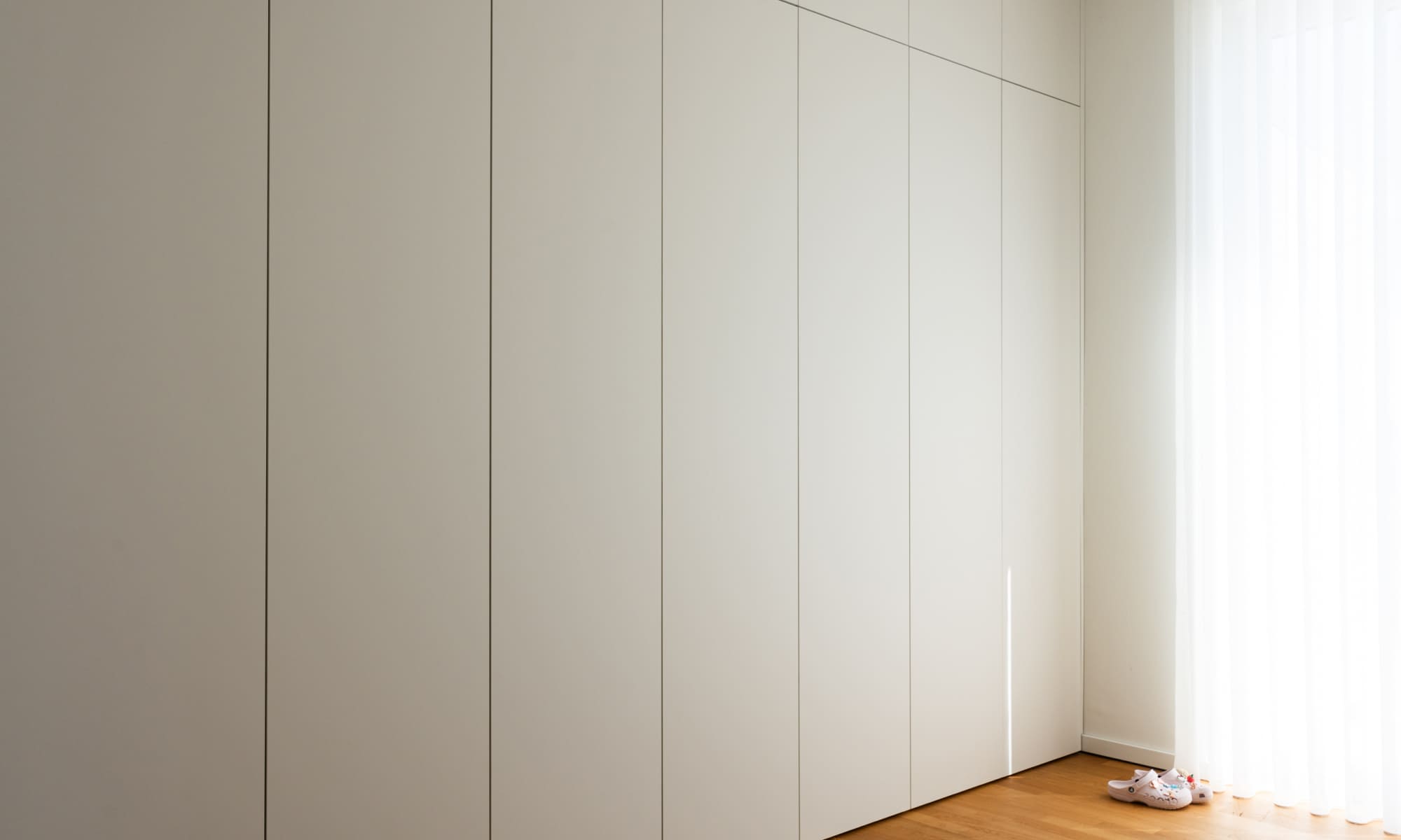 Durch maßgefertigte PAX-Türen und einen deckenhohen Aufsatzschrank haben wir den vorhandenen Platz vollständig genutzt – ohne sichtbare Übergänge, ohne Kompromisse.