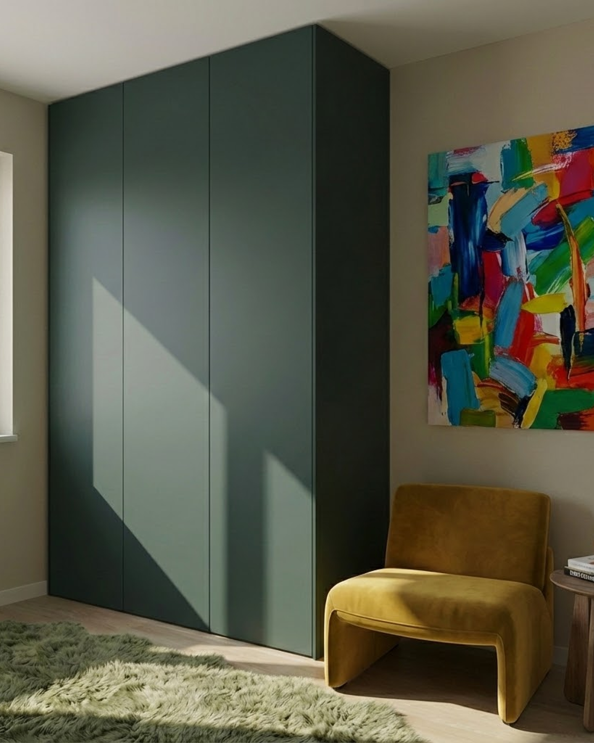 Close the gap between the cabinet and the wall for a true built-in wardrobe effect. Ensure a smooth, flush front view without any visible gaps.