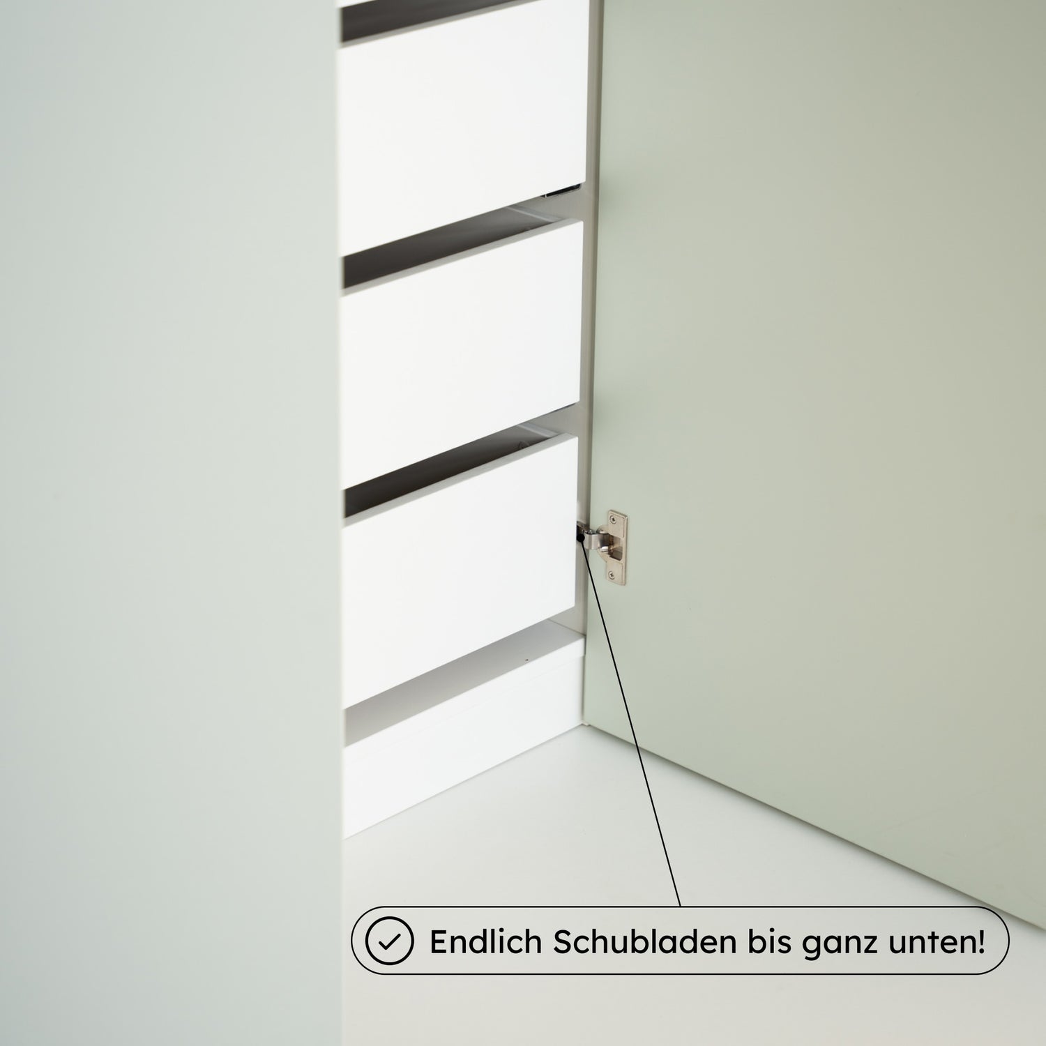 Mit unserem Select Living Spezialscharnier gehört das der Vergangenheit an. Du nutzt die unterste Schublade und kannst gleichzeitig Türen montieren – für maximale Funktion und einen cleanen Look.